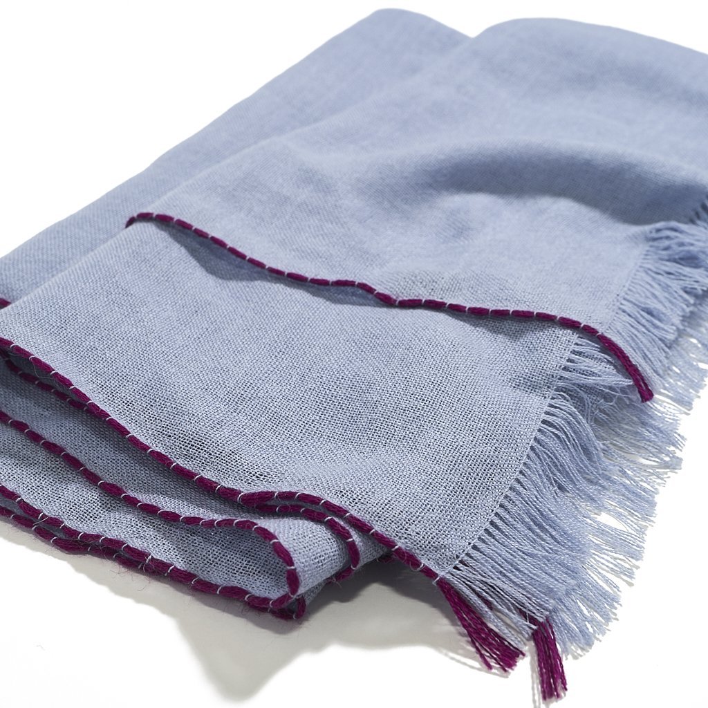 After scouring the globe, we are confident that we have found you the world's softest alpaca scarf. Made from super fine baby alpaca, this sophisticated baby blue scarf with magenta trim will keep you comfortably cozy indoors and toasty warm when styled with your winter coat.