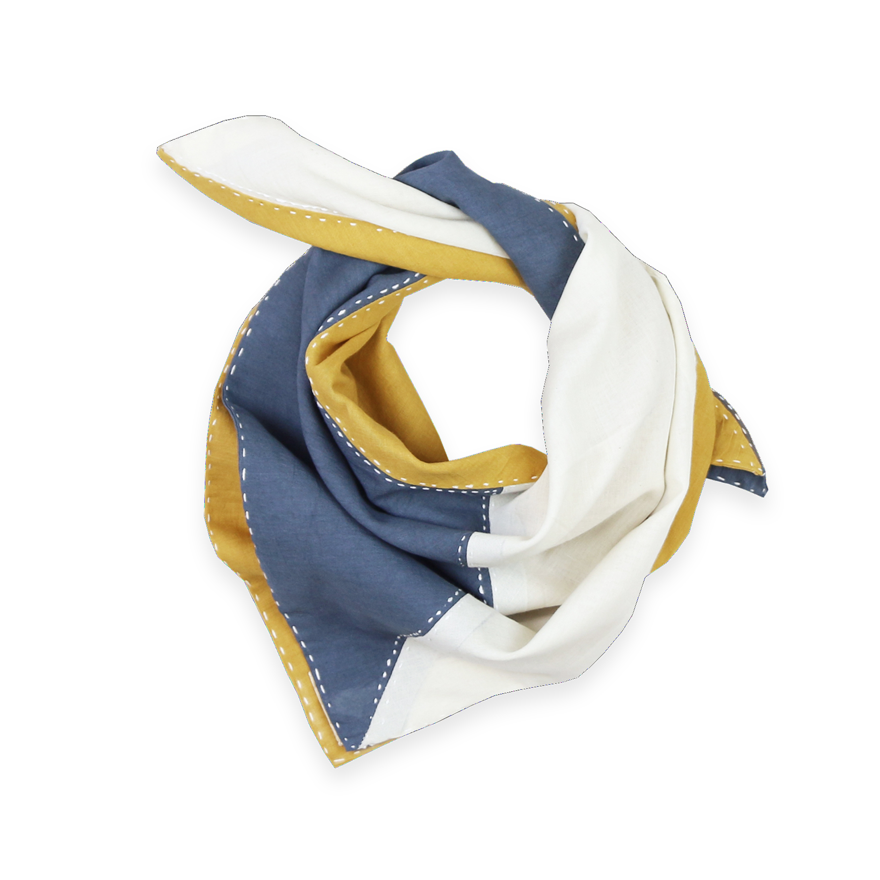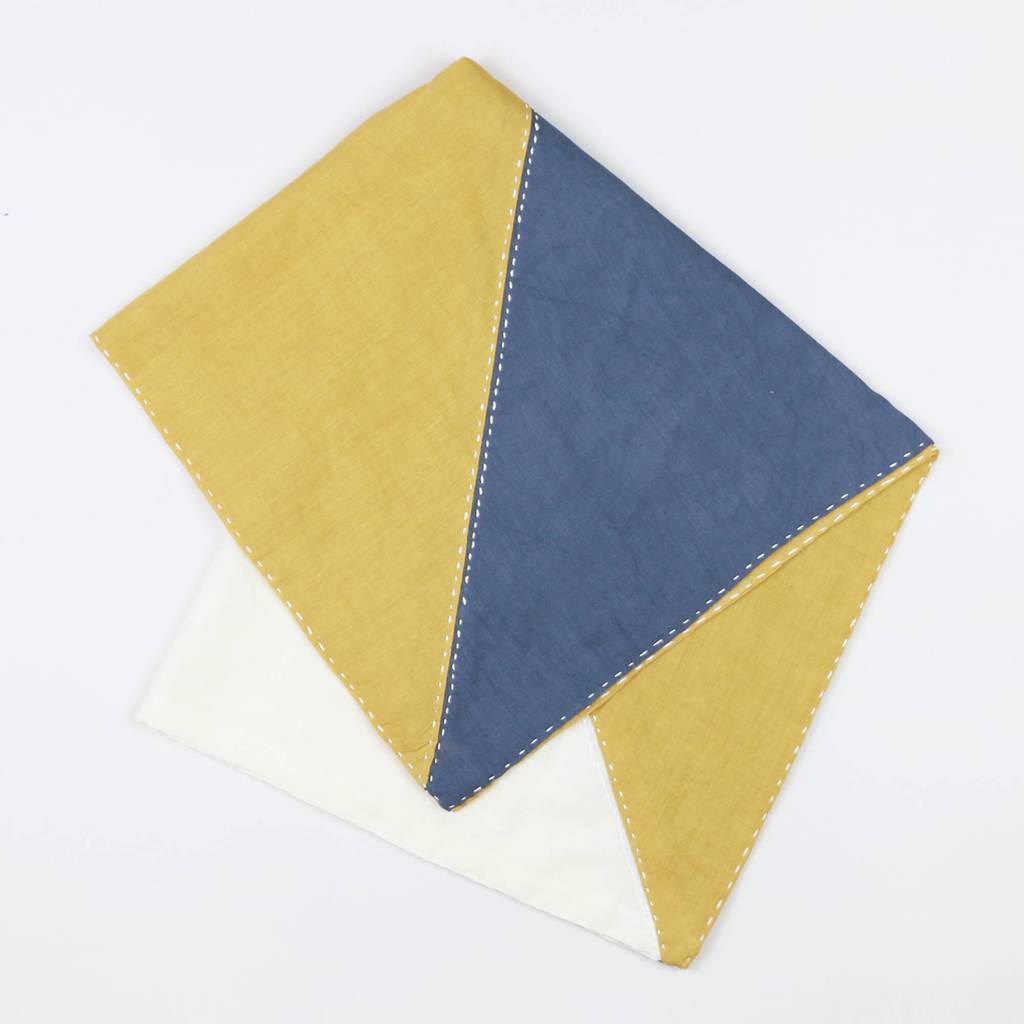 Hand-stitched from the softest organic cotton, the mustard yellow and blue-grey panelling brings a fresh_pop of color to your wardrobe. Tie this lightweight scarf to your tote bag, wear it as a neckerchief, or wrap it in your hair._Handmade by artisan women in India, this beautiful square scarf is the perfect multi-purpose accessory.